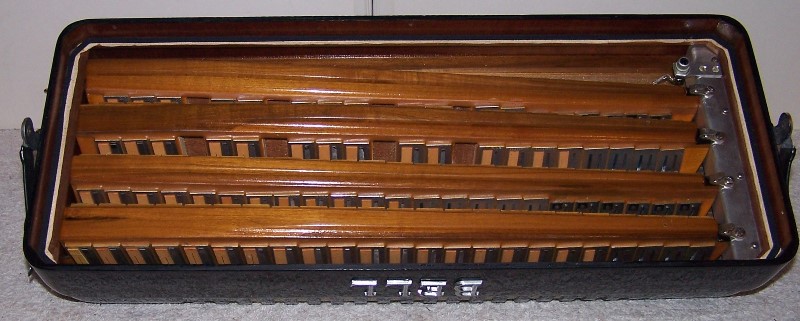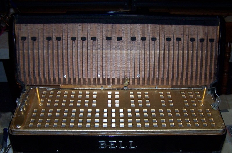 This full size professional accordion is a very special instrument of exceptional quality! As the great accordion craftsman Aldo Mencaccini says, these accordions were built to last forever. According to the Bell catalog "The reeds are closely seated on individual duraluminum plates - then mounted on walnut-faced, highly varnished reed blocks. They "speak" immediately upon command - with tremendous carrying power for every subtlety of tone, from the most delicate to the most dynamic. The superlative quality of these reeds and the careful precision fitting of each read plate are a significant part of the reason for the beauty of Bell's tone."