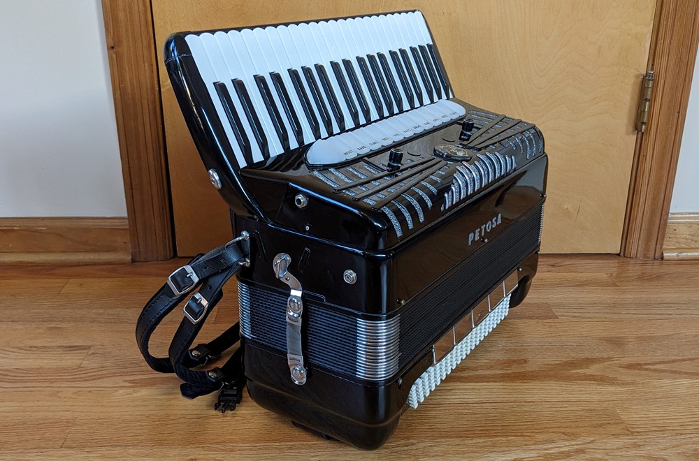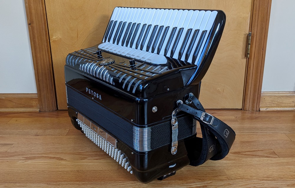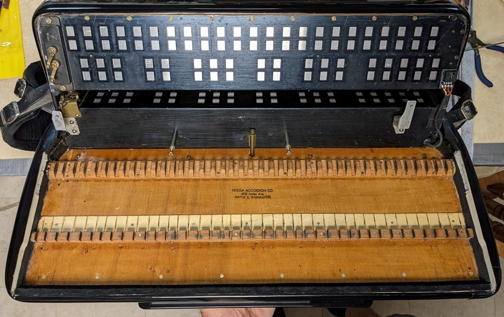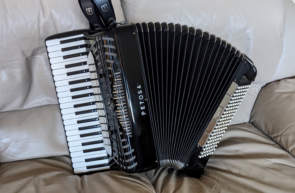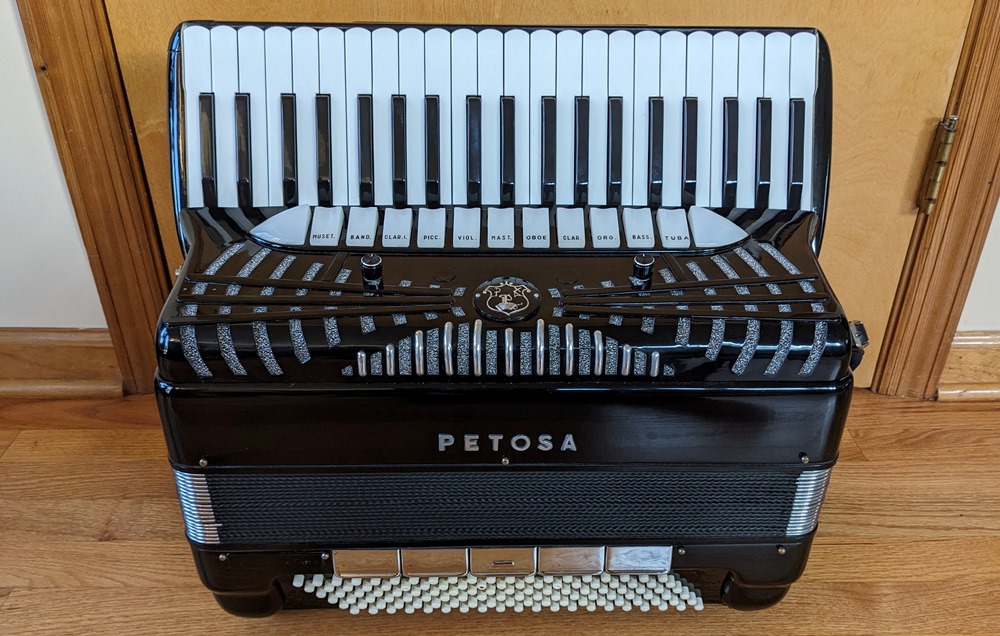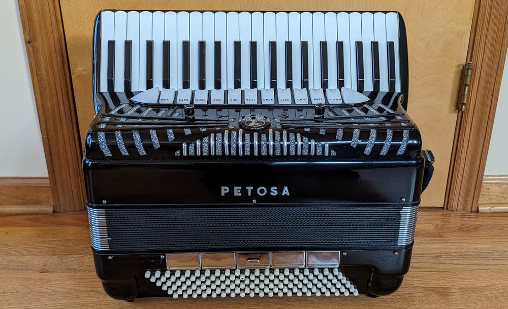 This Petosa Chambertone accordion was built in 1954 and to this day remains a standard for quality in the Accordion World. The instrument has been played and loved over the years, professionally maintained by Petosa Accordions, and most recently serviced at the Accordion Gallery in July 2024. In 2019 I purchased 3 Chambertone models from the Petosa Family. Joe Petosa Sr. described this particular instrument very accurately: "Immaculate condition, this rich, resonant and powerful Chambertone is aged like a bottle of fine wine – a truly beautiful piece of history that any professional will appreciate."