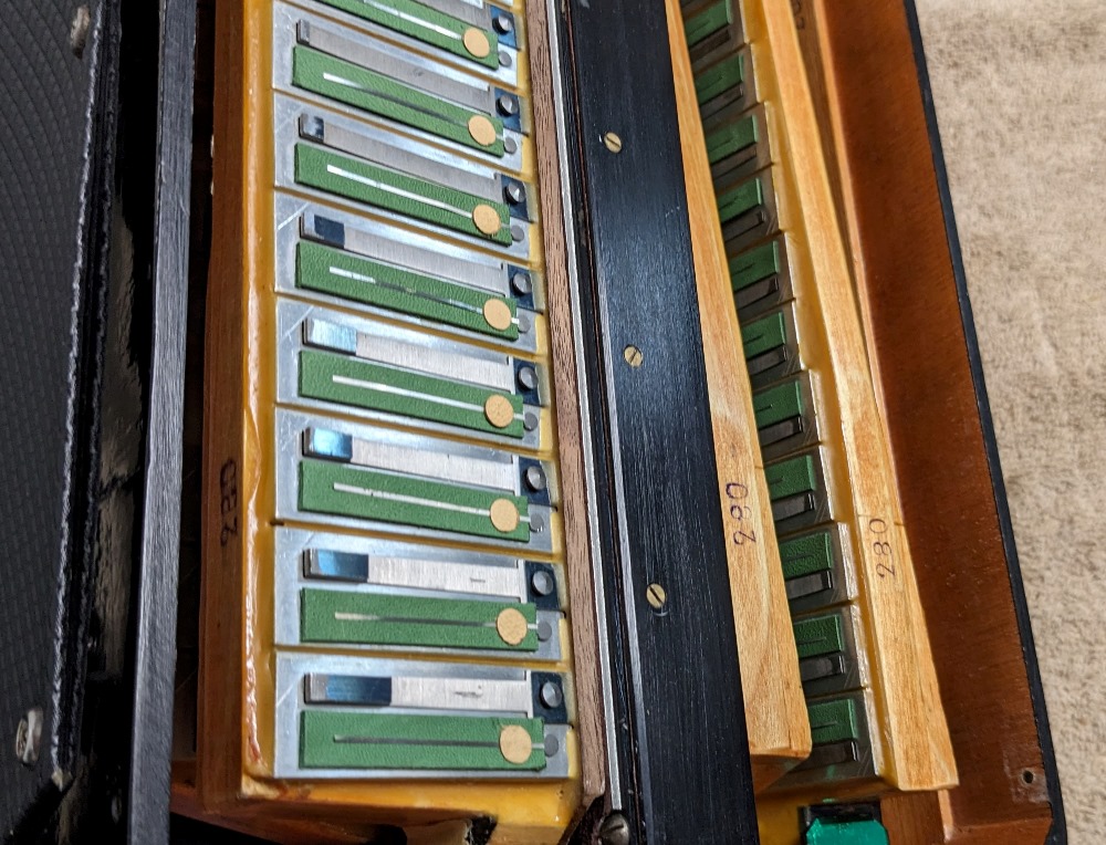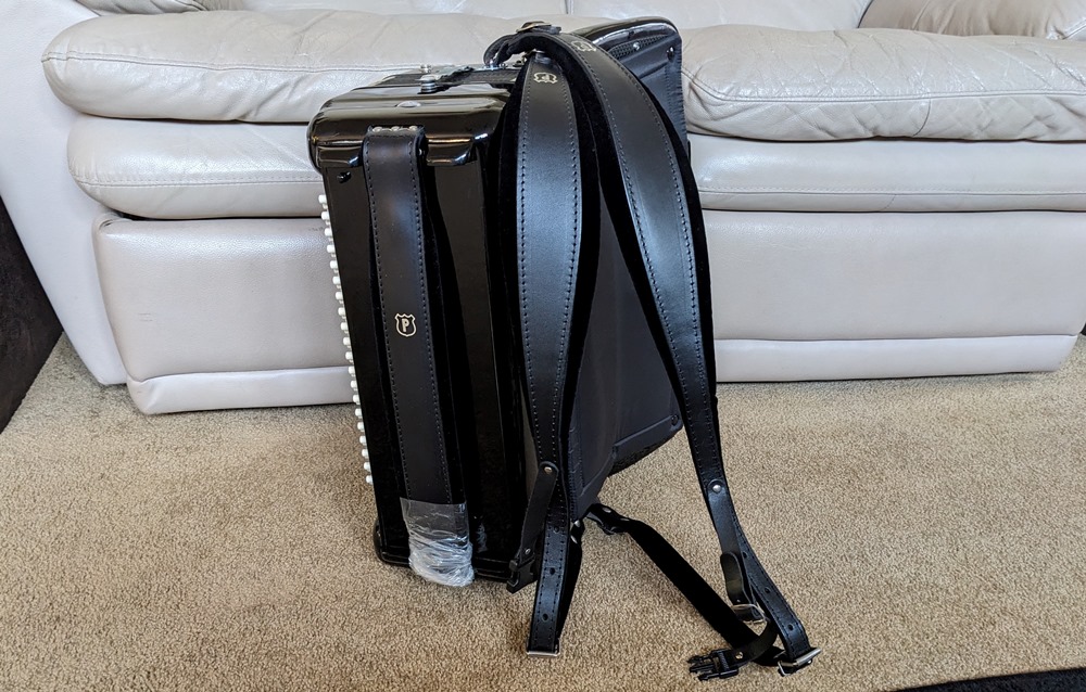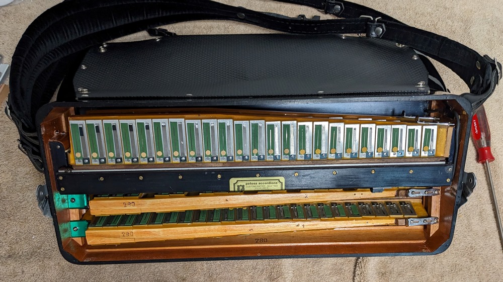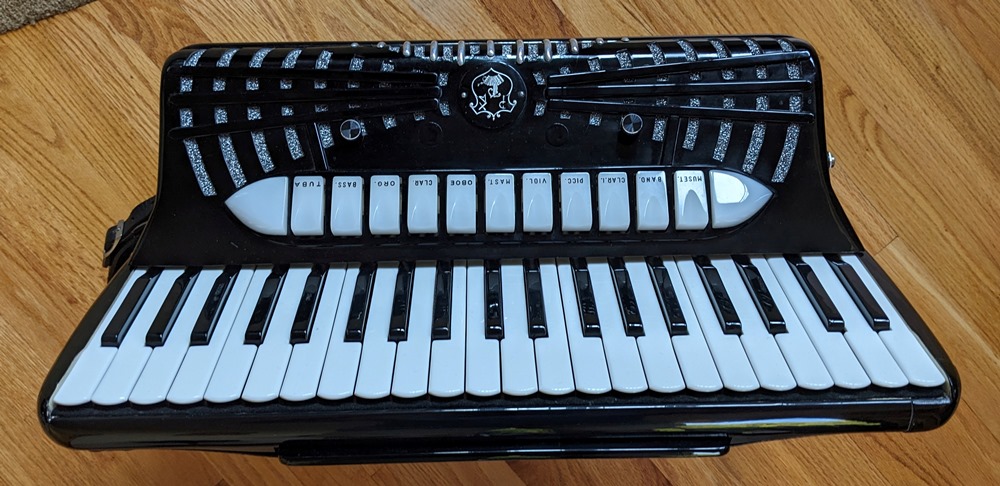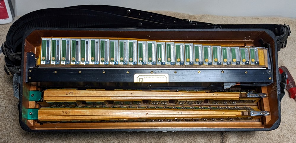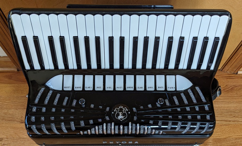 This Petosa Chambertone accordion was built in 1954 and to this day remains a standard for quality in the Accordion World. The instrument has been played and loved over the years, professionally maintained by Petosa Accordions, and most recently serviced at the Accordion Gallery in July 2024. In 2019 I purchased 3 Chambertone models from the Petosa Family. Joe Petosa Sr. described this particular instrument very accurately: "Immaculate condition, this rich, resonant and powerful Chambertone is aged like a bottle of fine wine – a truly beautiful piece of history that any professional will appreciate."
