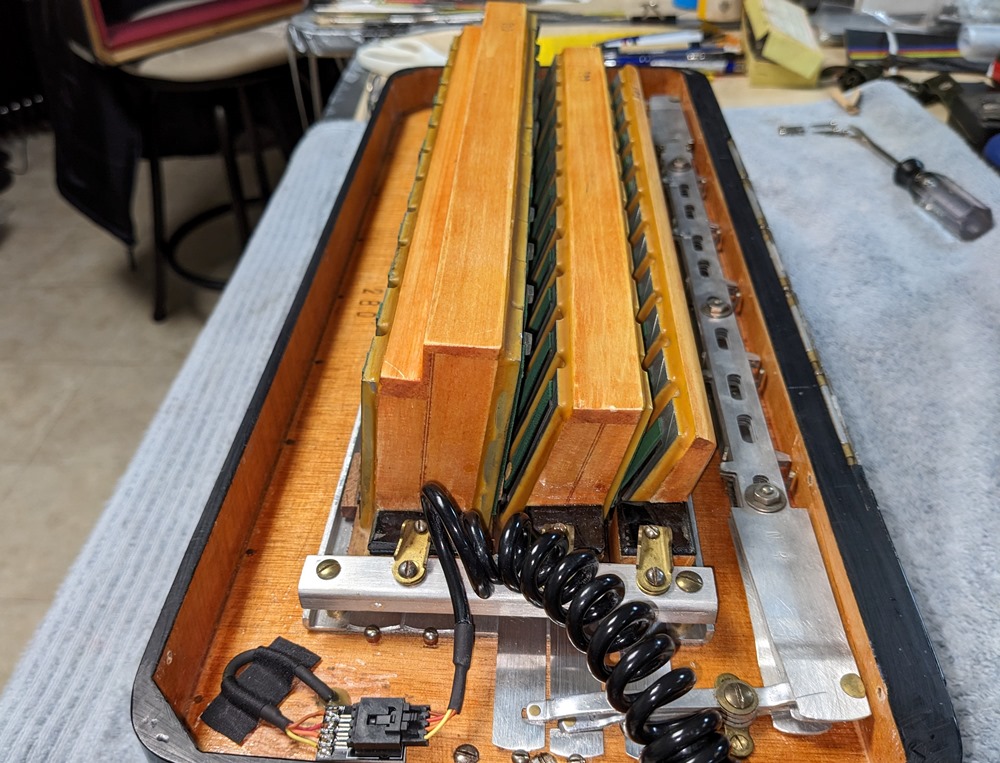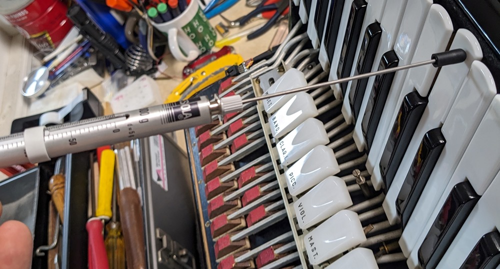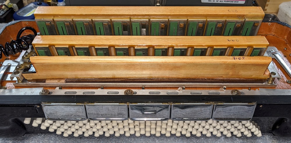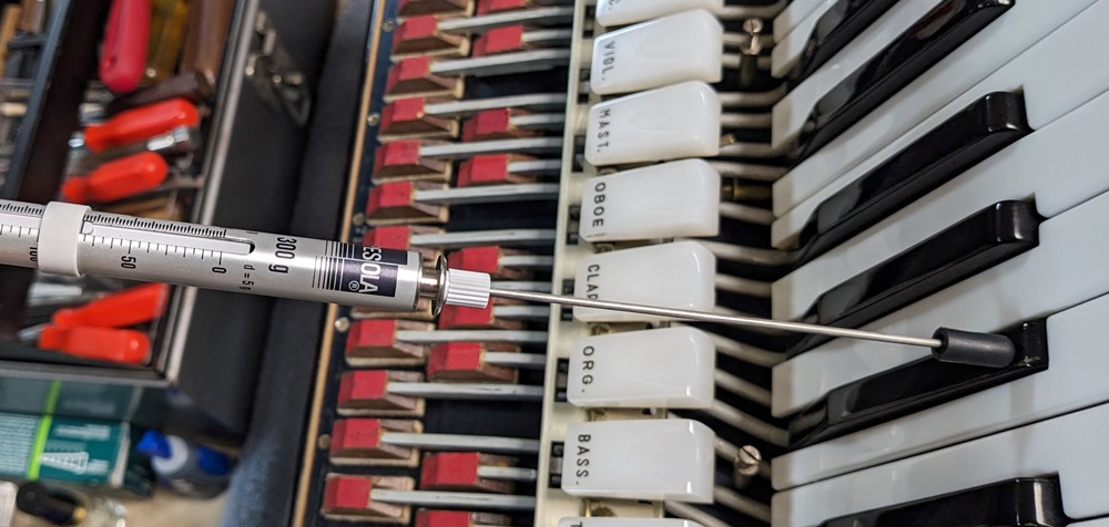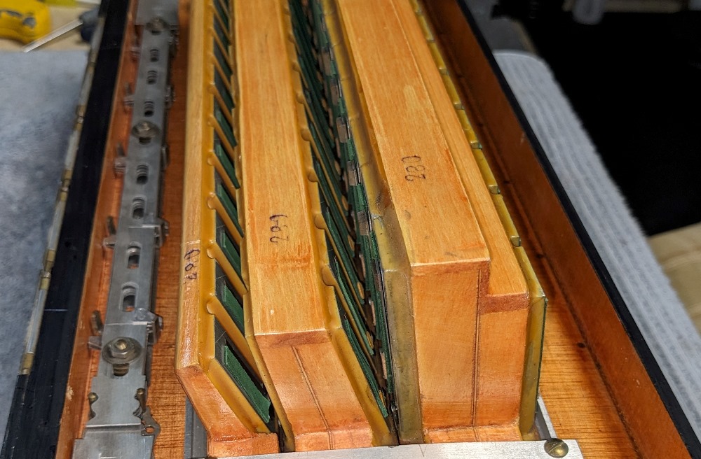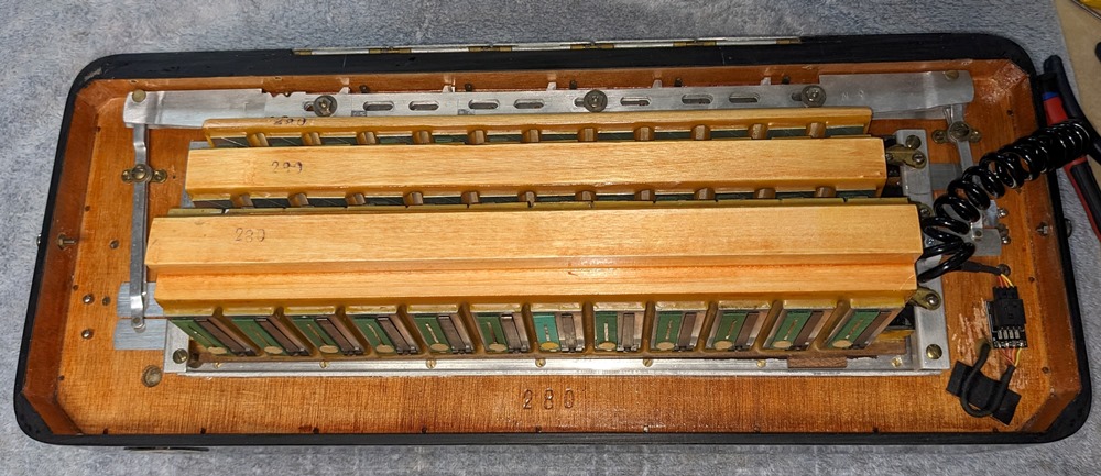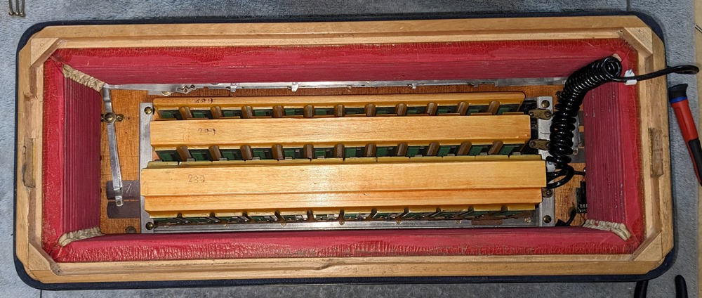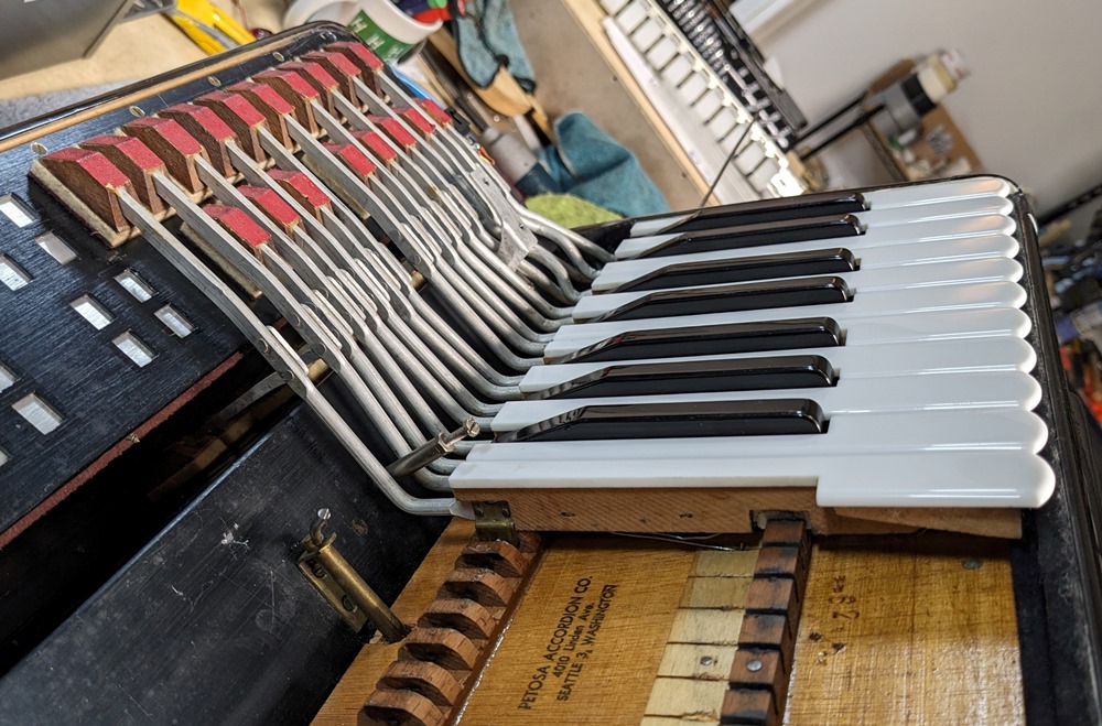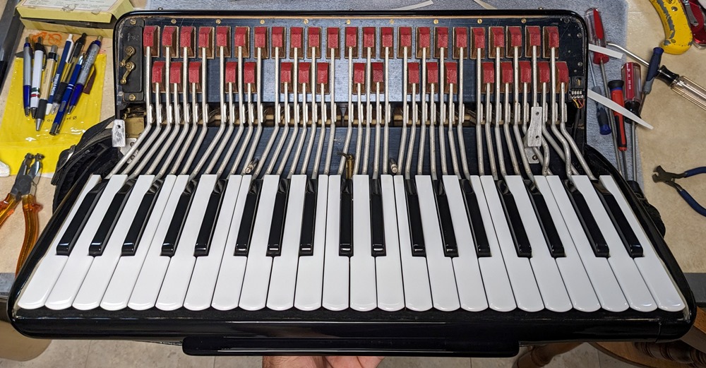 All valves are made of white natural felt and leather and are in very good condition. The keyboard action is fast and silent.