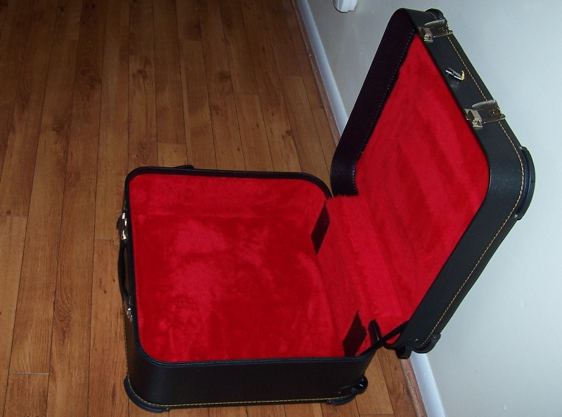 - Hard-shell case with wheels and a side handle