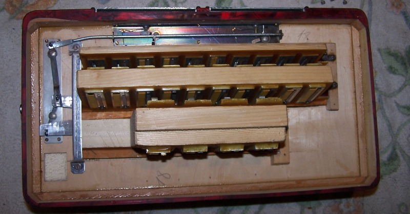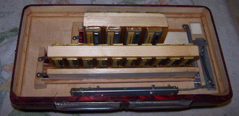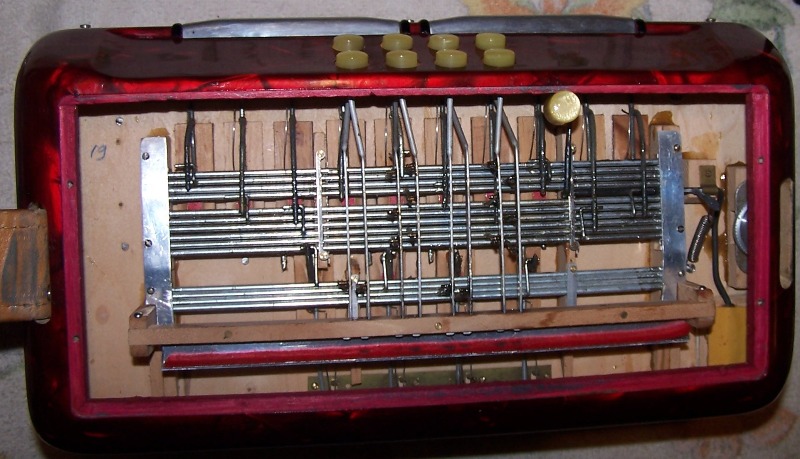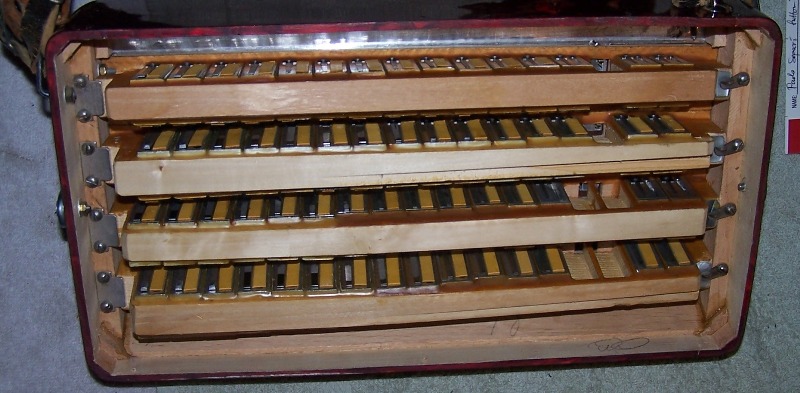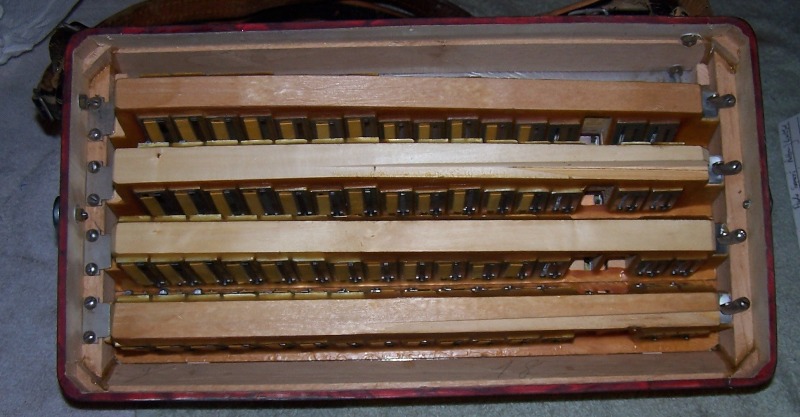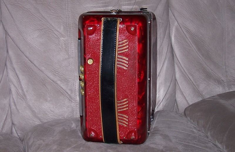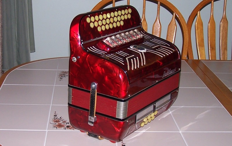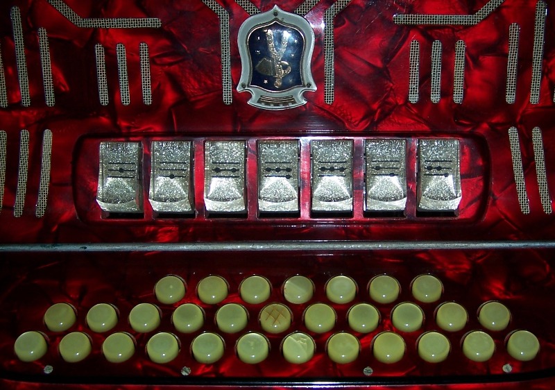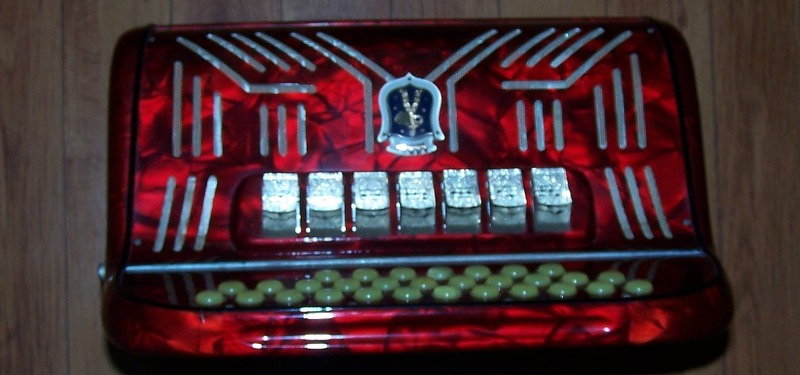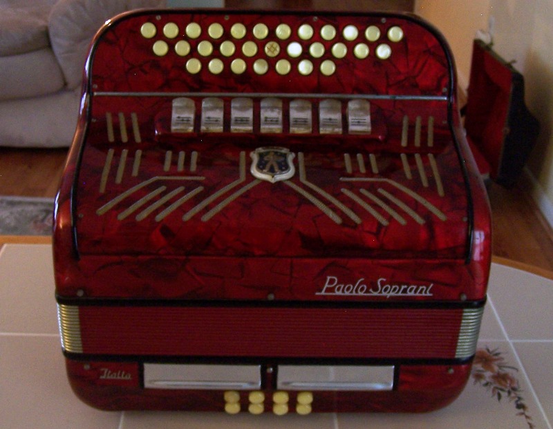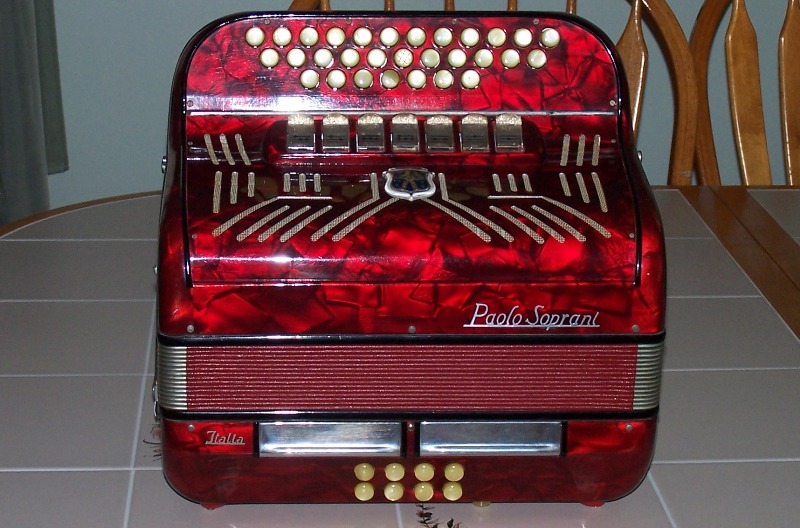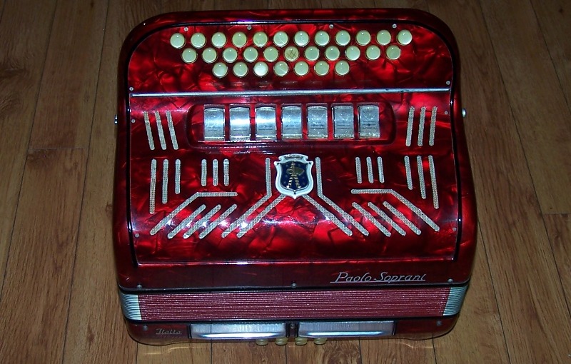 Paolo Soprani is the oldest accordion manufacturer in Castelfidardo. The founder's sculpture is greeting the visitors of the Accordion Museum in the town. The brand has enjoyed recognition and respect throughout the years. Recently I had the opportunity to restore a beautiful diatonic Paolo Soprani from the 1950's The instrument has all original parts. The fresh wax will guarantee robust performance for many years. The accordion has 4 sets of reeds with full rich musette sound and weighs only 14.6 lb. The compression is excellent. The mechanics works smooth. The tone will charm you with its authenticity and harmonic richness.